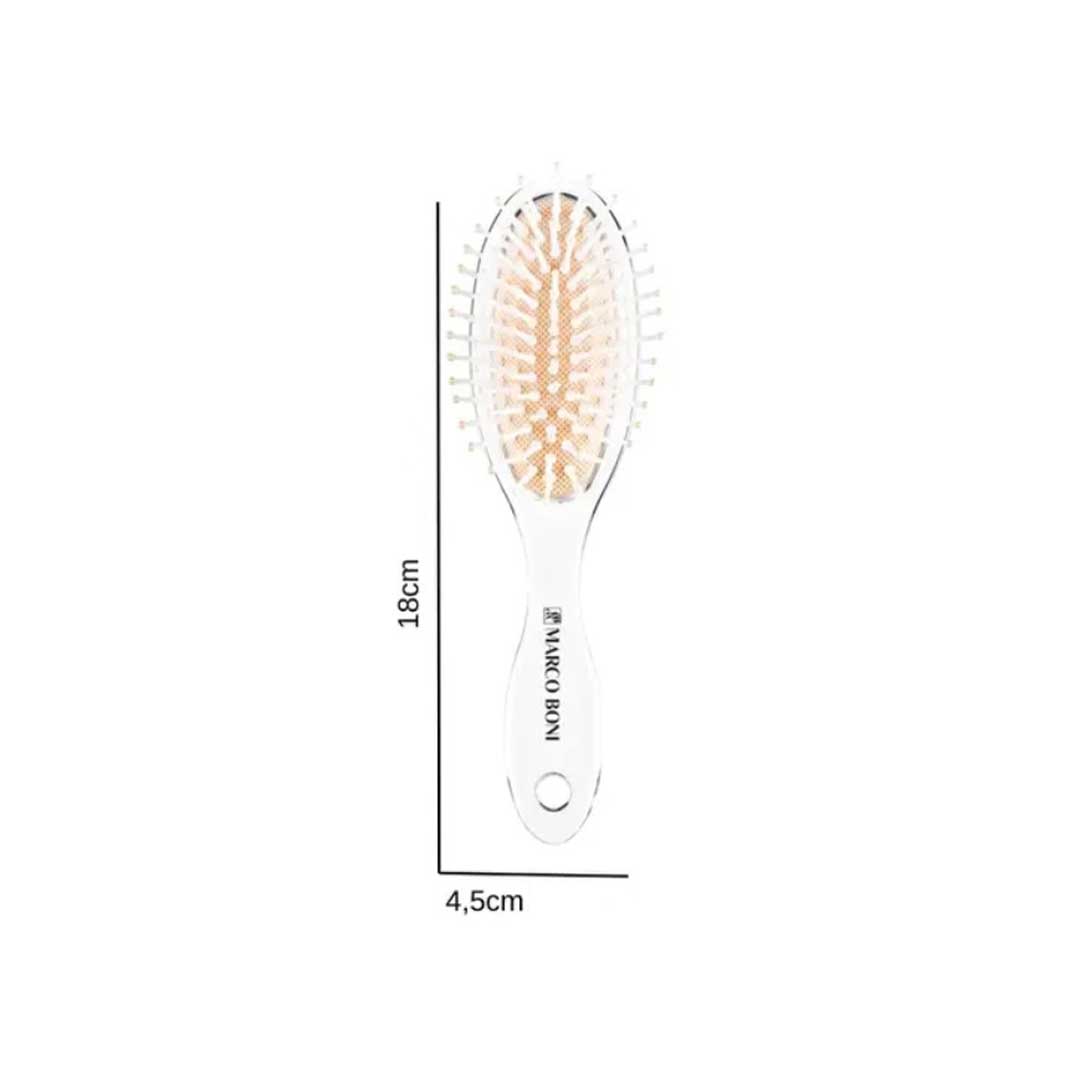 El Cepillo Diamond Oval Marco Boni está pensado para uso diario: su cuerpo en acrílico transparente y las cerdas de nylon con puntas redondeadas/bolitas desenredan con suavidad, masajean el cuero cabelludo y ayudan a evitar quiebre y frizz.